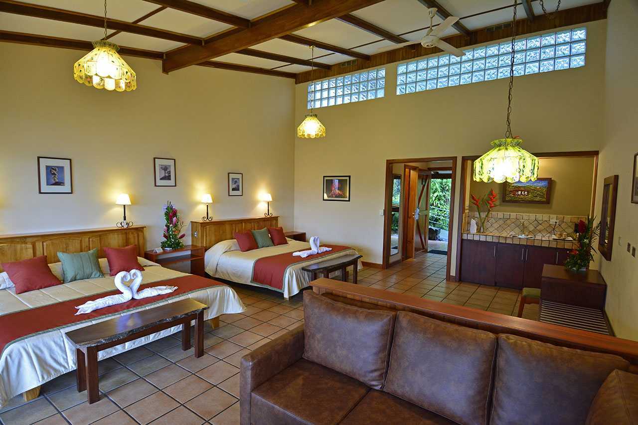 The Junior Suite rooms at Arenal Observatory Lodge & Spa are located near the restaurant, these spacious rooms have a spectacular view of the Arenal Volcano and a beautiful view of Lake Arenal from a terrace. For your comfort, each room has two King beds, a small room, safe, coffee maker, and a small refrigerator.