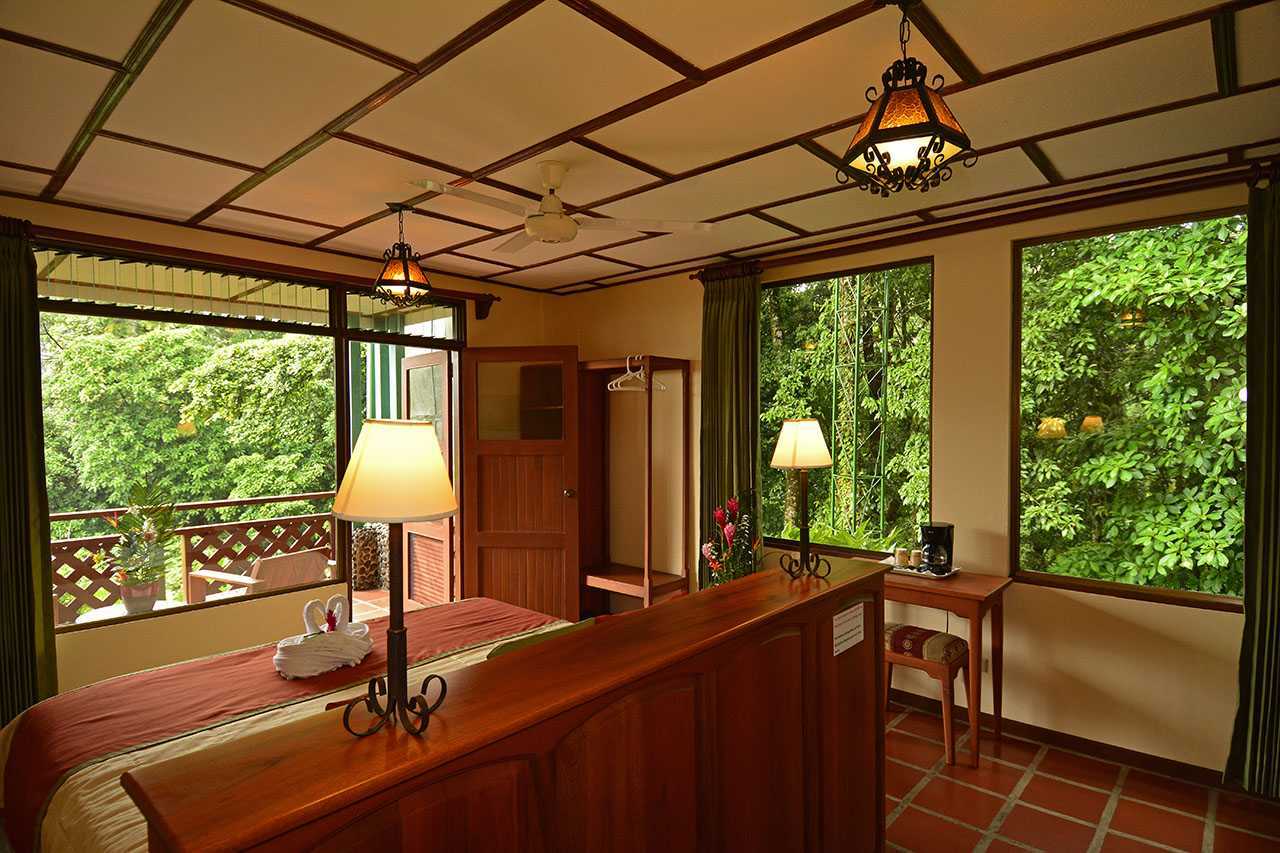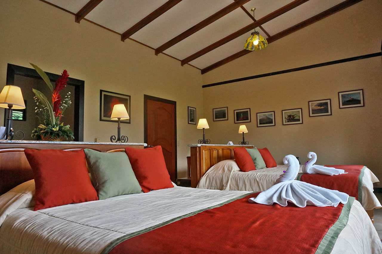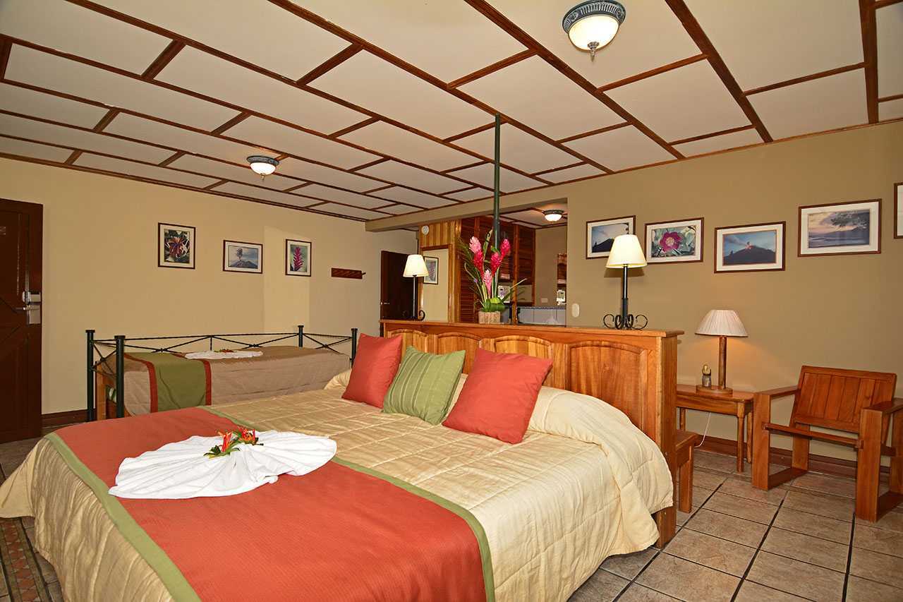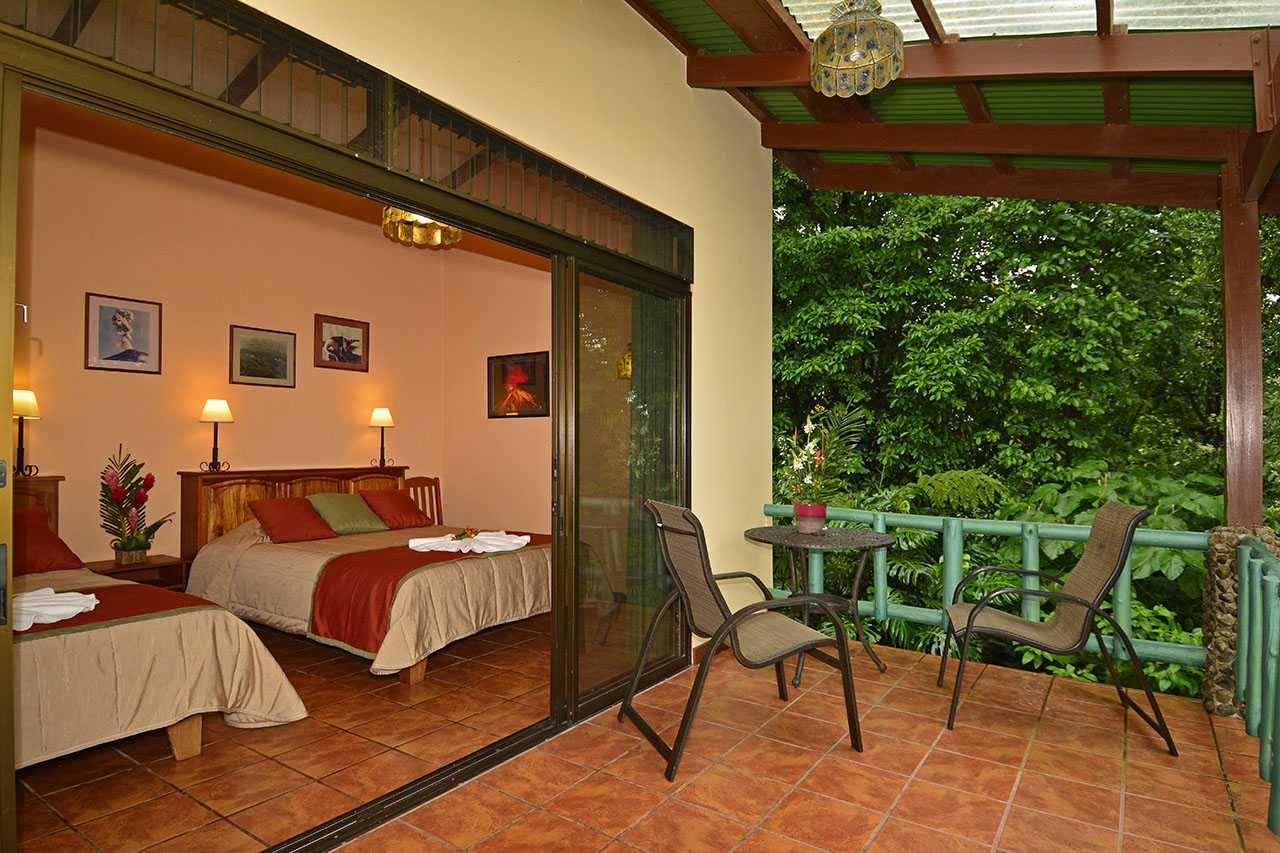 Our Smithsonian Rooms are located either in the main hotel building, by the hotel restaurant or near the swimming pool area. They all showcase huge picture windows which frame the majestic Arenal Volcano and the beautiful rainforest and gardens. Smithsonian Rooms have two queen-sized beds (4 rooms have one king-sized bed), a private bathroom, a private deck, a coffeemaker, and a room safe. Five rooms are fully equipped for disabled guests with wheelchair access.