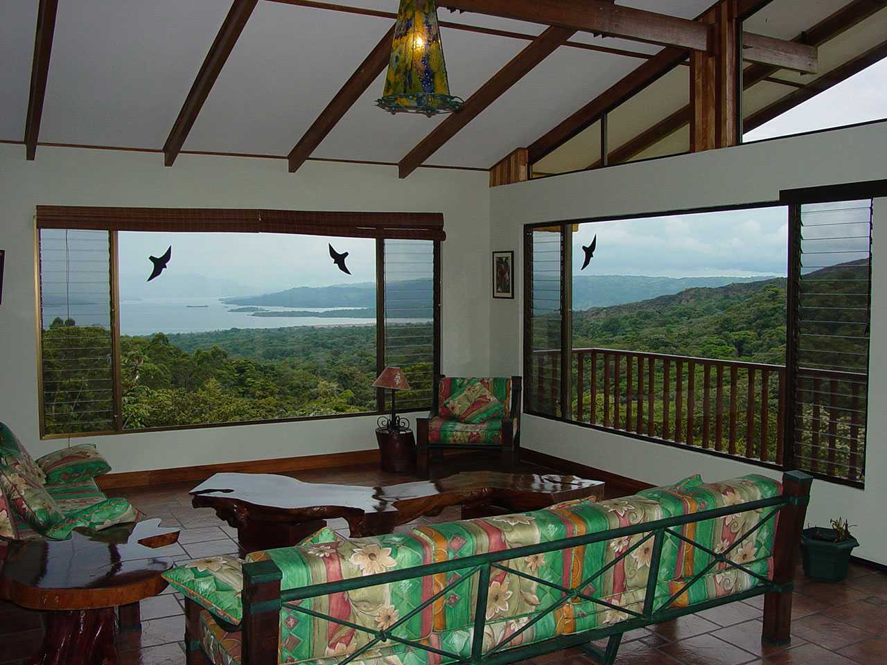 The main level entrance leads into a well-ventilated living room with huge picture windows, a “wall-to-wall” balcony, a dining room, a fully-equipped kitchen, a satellite television, and a full bathroom. From the balcony, you have dramatic panoramic vistas of Arenal Volcano and Lake Arenal. Downstairs on the lower level, two bedrooms each have one king-sized bed, one twin bed, and one single hideaway bed, accommodating eight persons in total. Each room has its own private bathroom and a room safe.