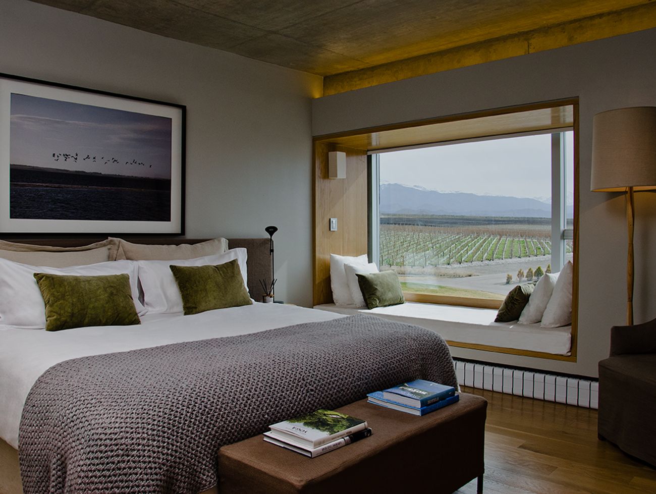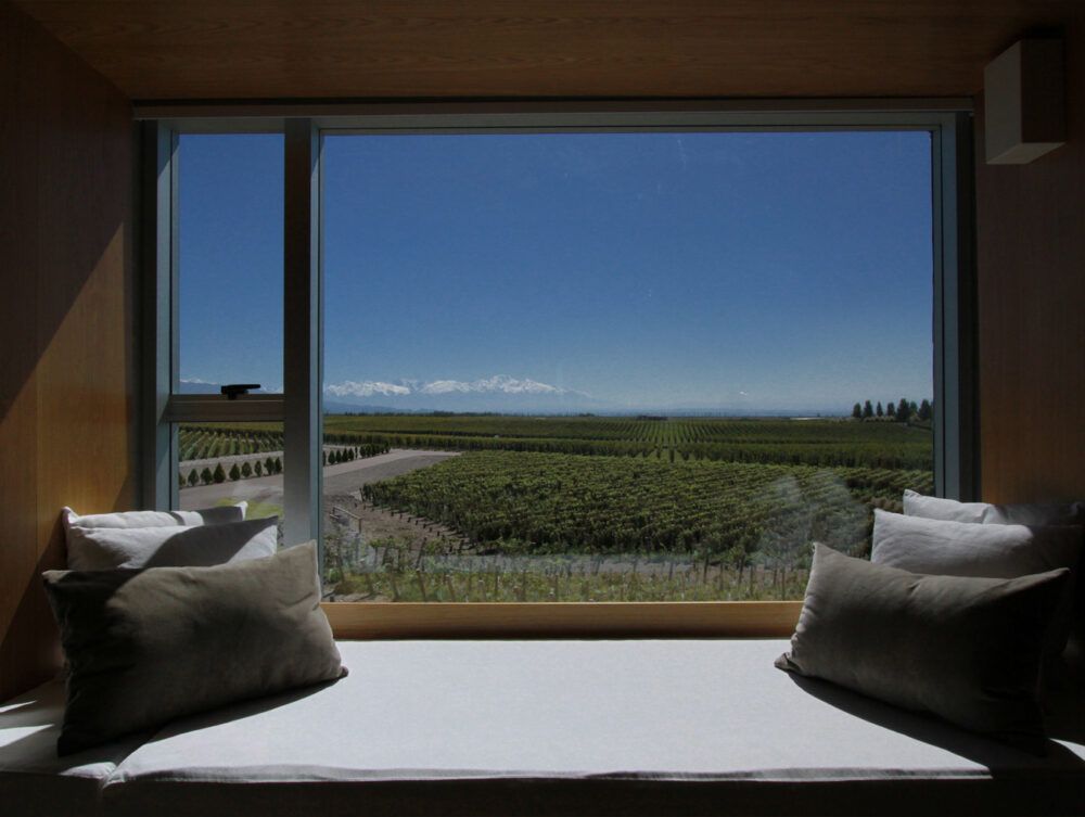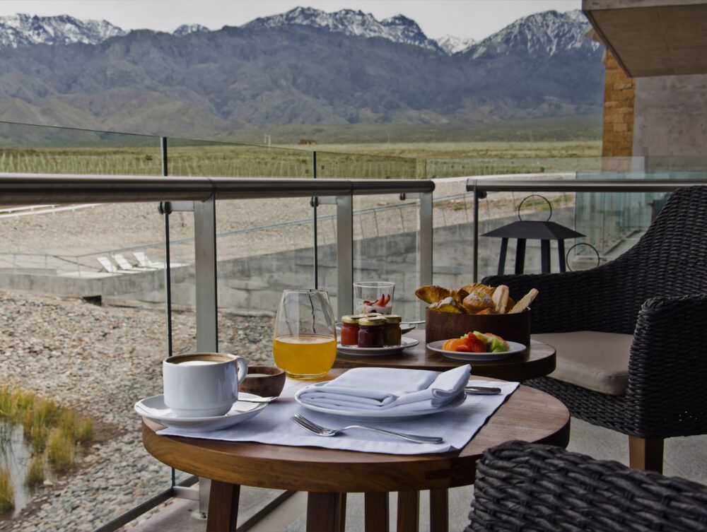 - Chambres avec balcon privé ou large bow-window servant de divan et offrant vues sur les vignobles et la cordillère Cordón del Plata.