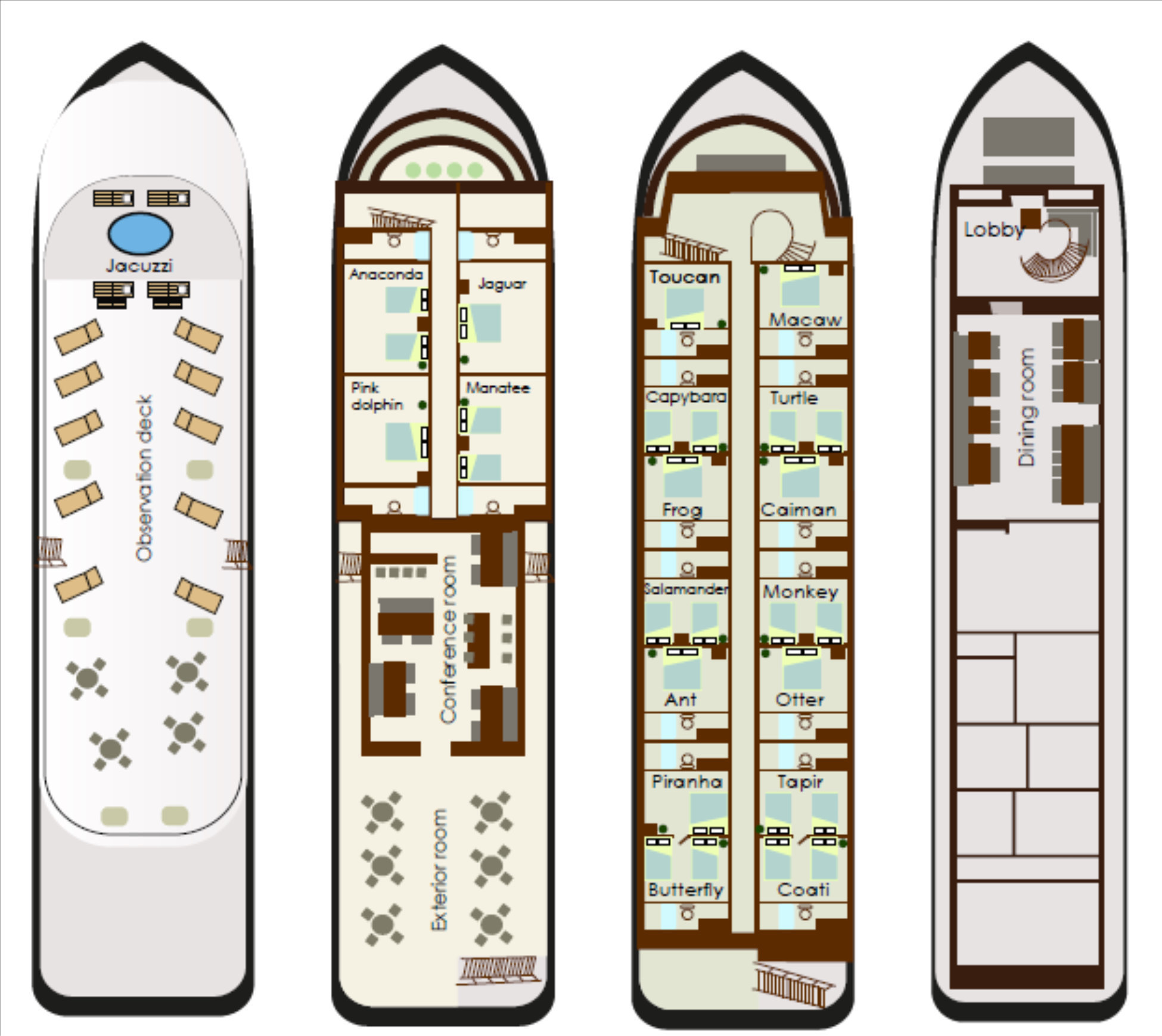 Het is een reis die ons naar het hart van de biodiversiteit van de Amazonebekken brengt. Zoals hieronder wordt beschreven, leert dit junglekoninkrijk ons dat de beste manier om het te verkennen, ons uniek vervoermiddel is. Door over de rivier te varen in een fantastisch schip met de laatste technologie. De Anakonda Amazon biedt veel comfort en heeft een conciërgeservice, een spa en verschillende menu-opties.