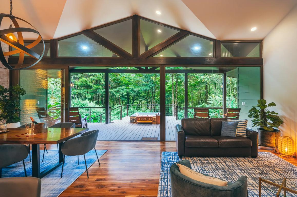 - Les portes coulissantes en verre du sol au plafond offrent une vue imprenable sur la forêt embrumée et les rivières cristallines environnantes