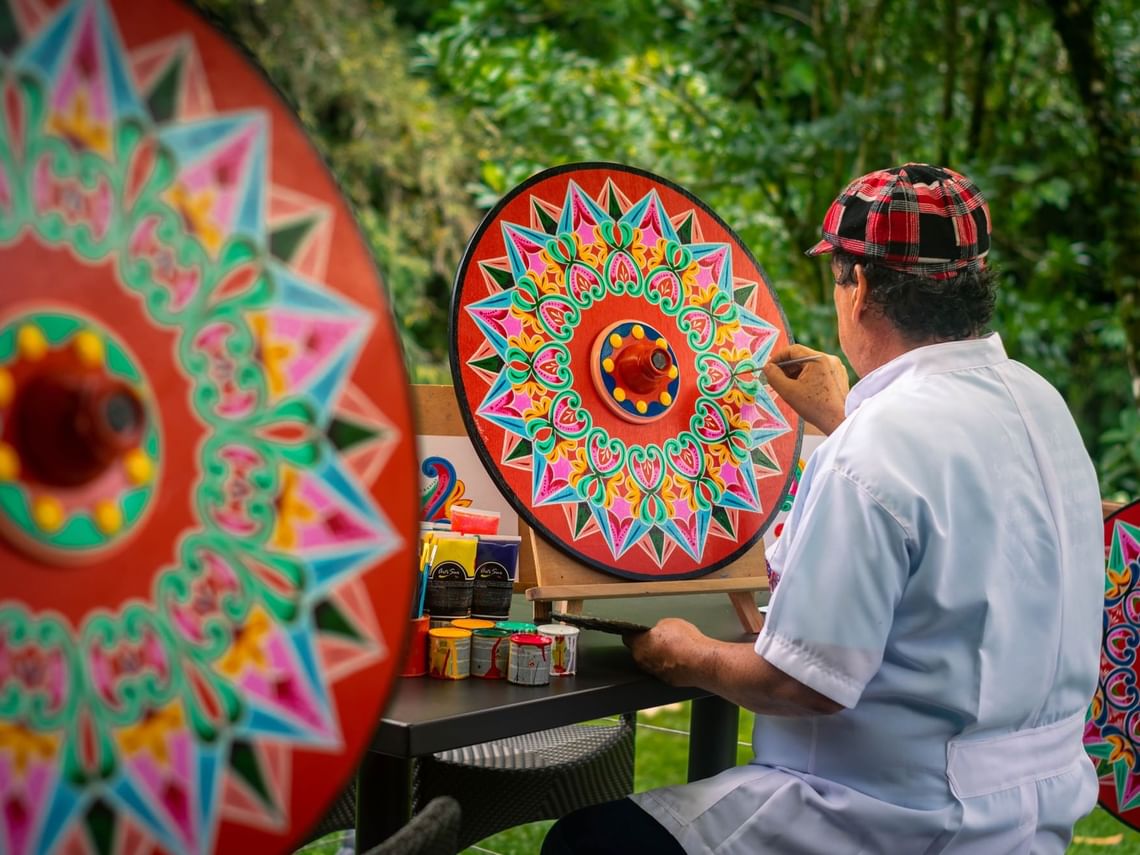 « Costa Rica’s traditional oxcarts are recognized by UNESCO as a precious cultural patrimony of humanity. Graced by intricate designs of kaleidoscopic beauty, they are the most iconic graphic elements of our heritage. I am proud that the roots of this art form can be traced to my hometown, the community of Sarchí (30 minutes away from El Silencio). I learned the technique from my grandparents and I am honored to share this emblematic art form with our guests. Teaching how to paint a memento of an oxcart wheel fills me with pride. »