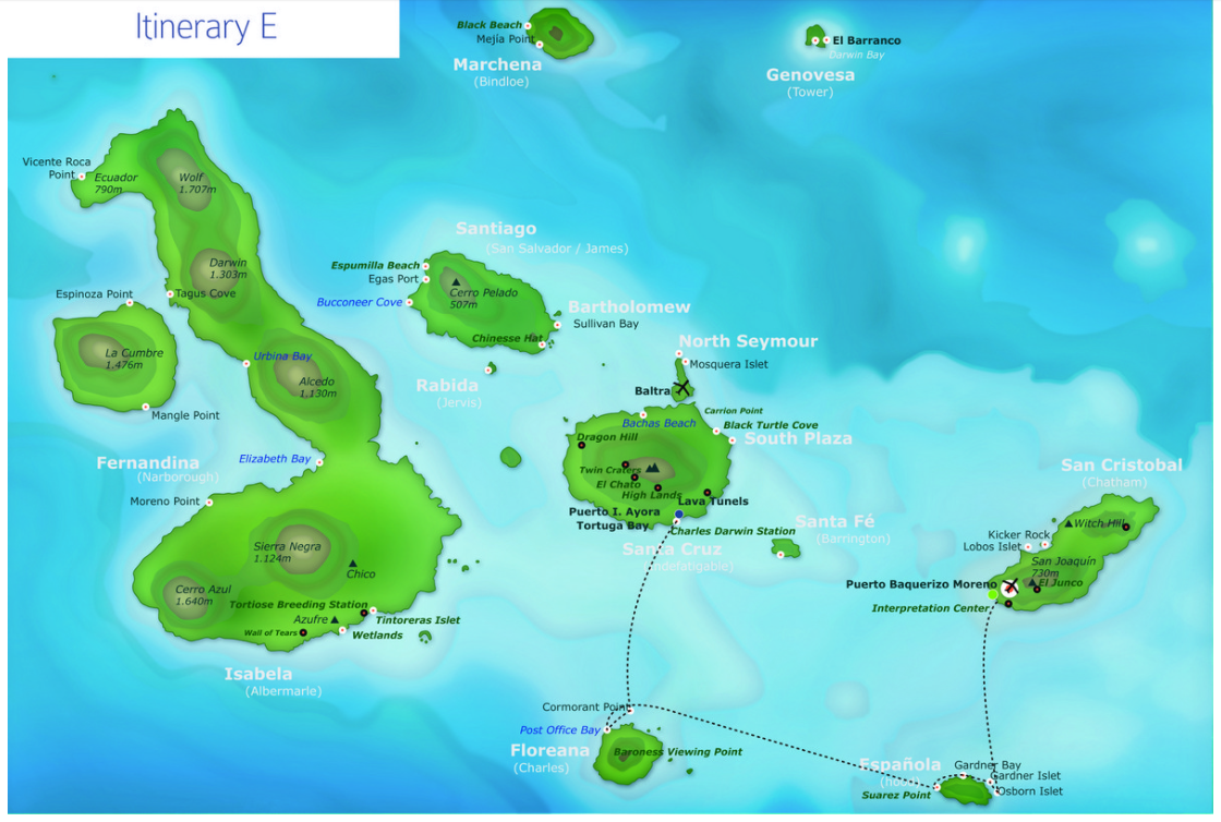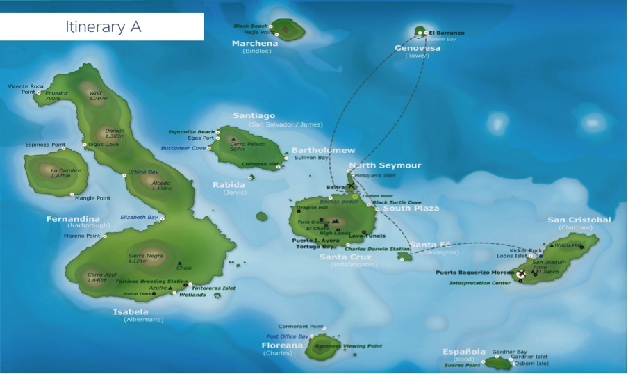 BALTRA - SANTA CRUZ - STATION CHARLES DARWIN - FLOREANA - ESPAÑOLA - SAN CRISTOBAL - SANTA FE - PLAZA SUR - SEYMOUR NORTE - MOSQUERA - GENOVESA