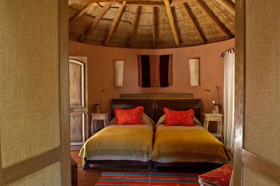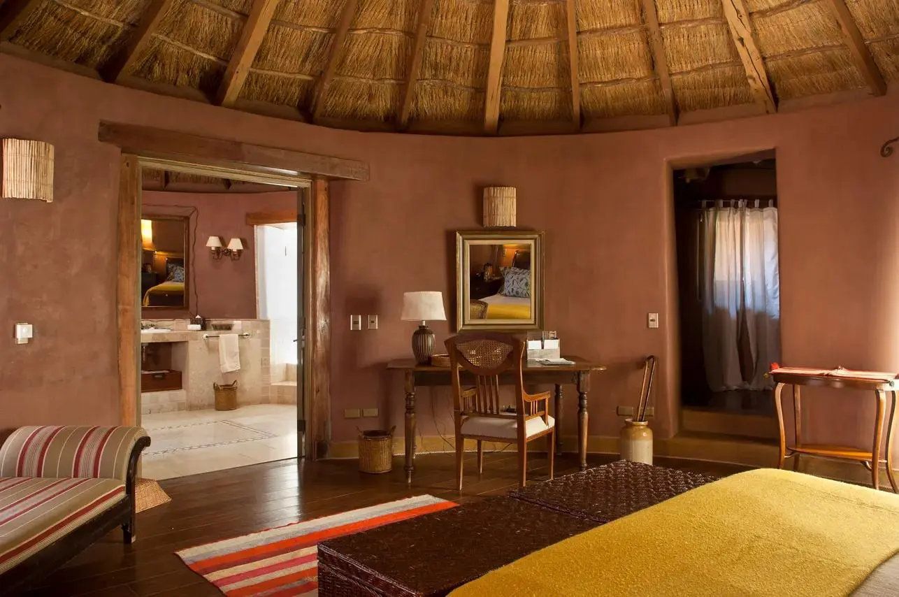 - This luxurious round room is built of stone, adobe and wood, and has a thatched roof – The ample space is designed for relaxation, privacy and well-deserved rest