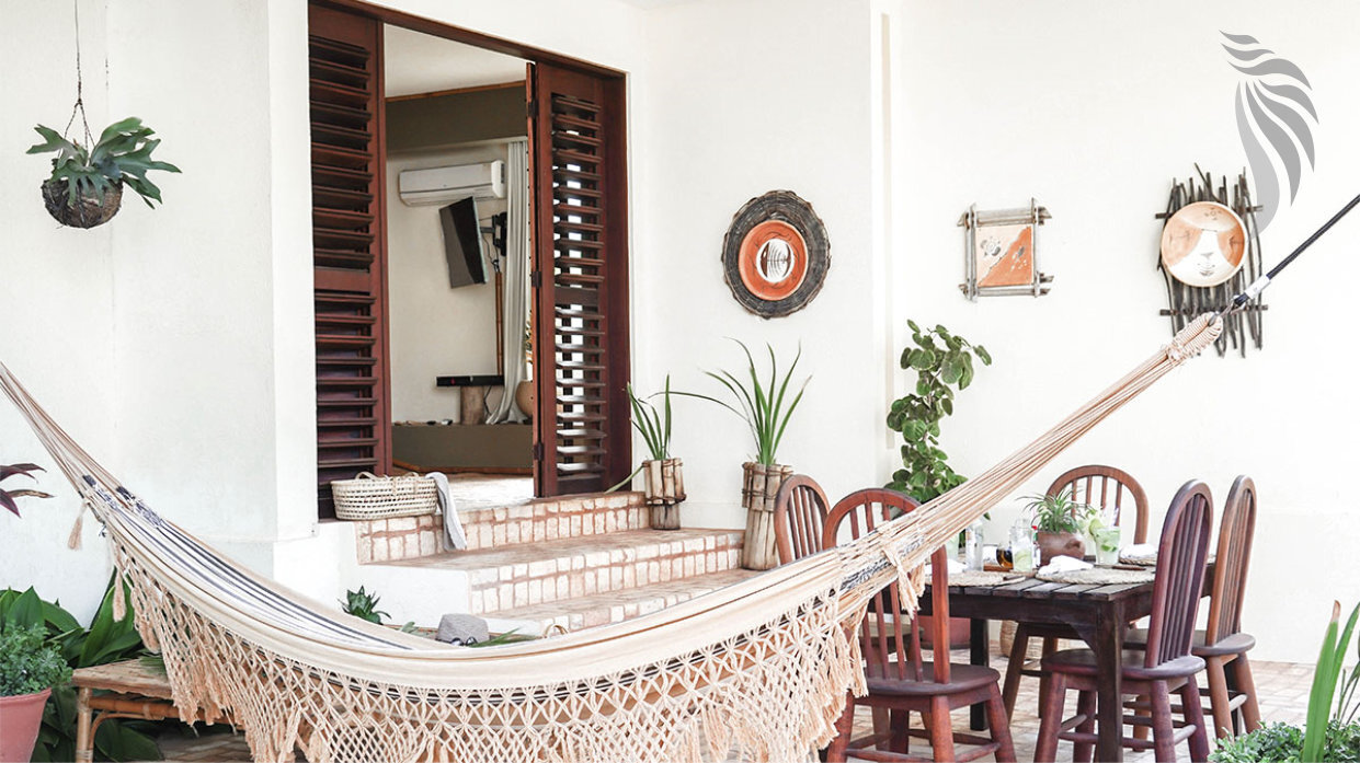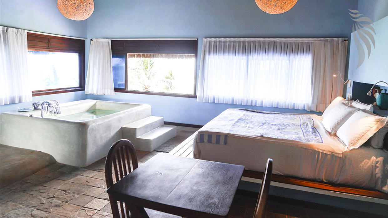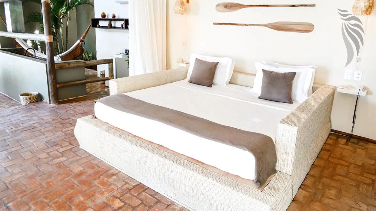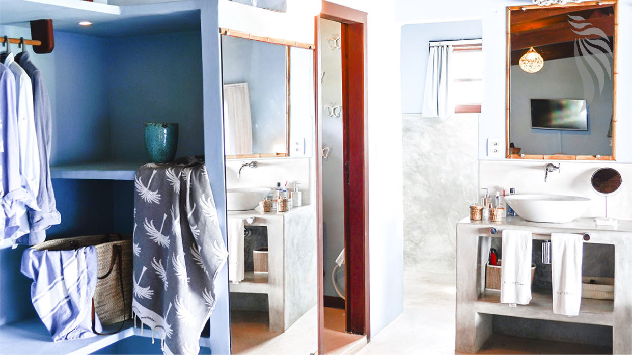 Situé au premier étage de la villa, il offre les meilleures vues sur la mer et le jardin de l'hôtel. Il dispose d'un balcon privé avec un hamac pour regarder le lever du soleil. Un vrai rêve !