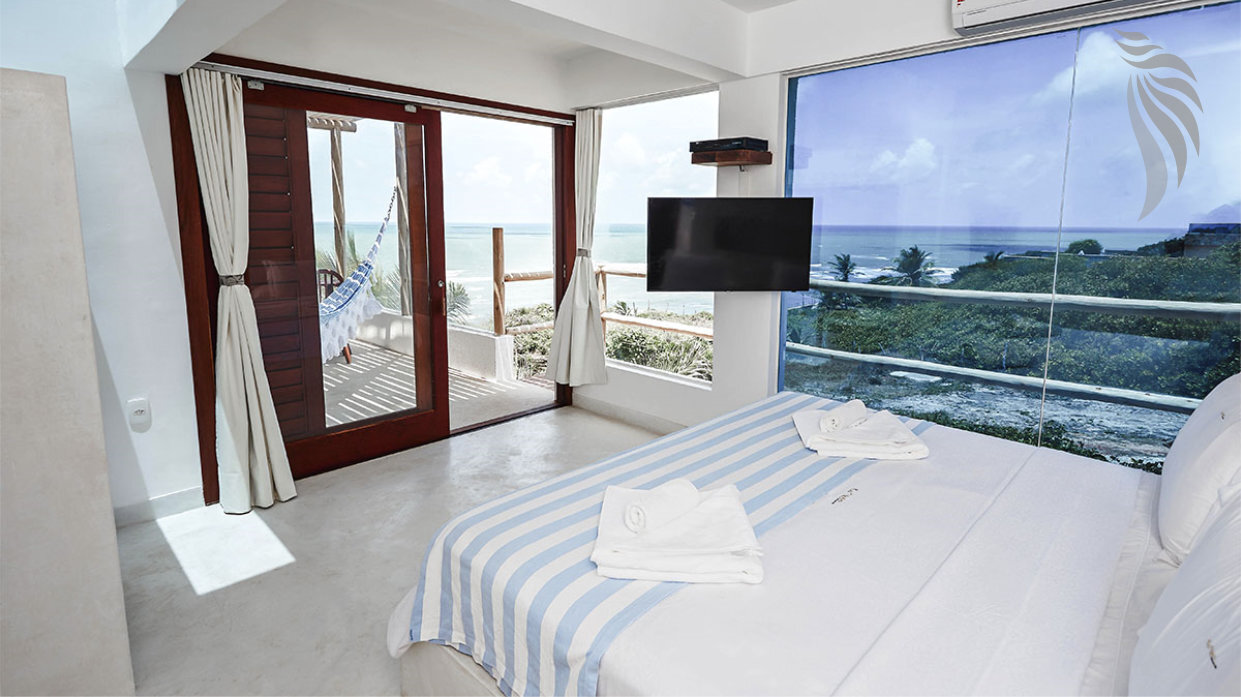 Située au rez-de-chaussée de la villa, la suite présente une décoration minimaliste et dispose d'un balcon avec accès direct à la piscine de l'hôtel, avec vue sur le jardin et la mer. L'écran avec projecteur est l'un des différentiels de l'hébergement, avec son système de son surround.