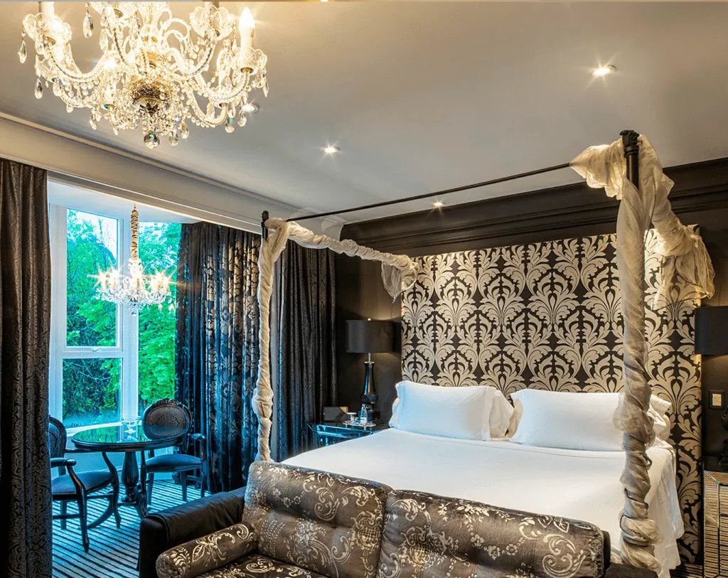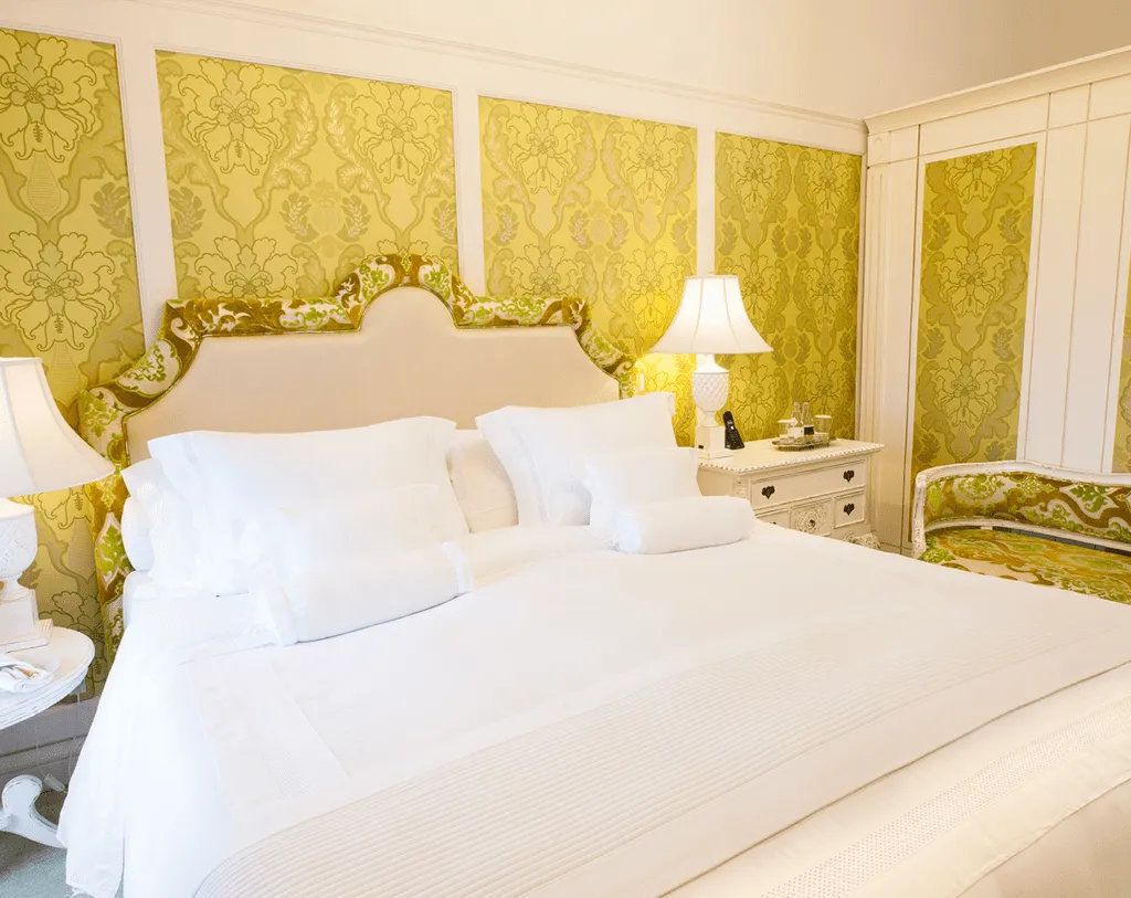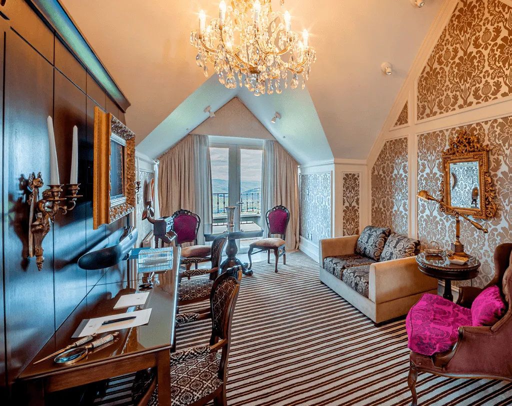 - Emerald Suite -26sqm - Elegance and boldness are the hallmarks of this suite, decorated in shades of green and white. The golden details add the final touch to the refined interior. -A room as sophisticated as the gem that inspires it. - The high ceiling further enhances the feeling of being in a castle complete with the delicate crystal chandelier that hangs over the bed.