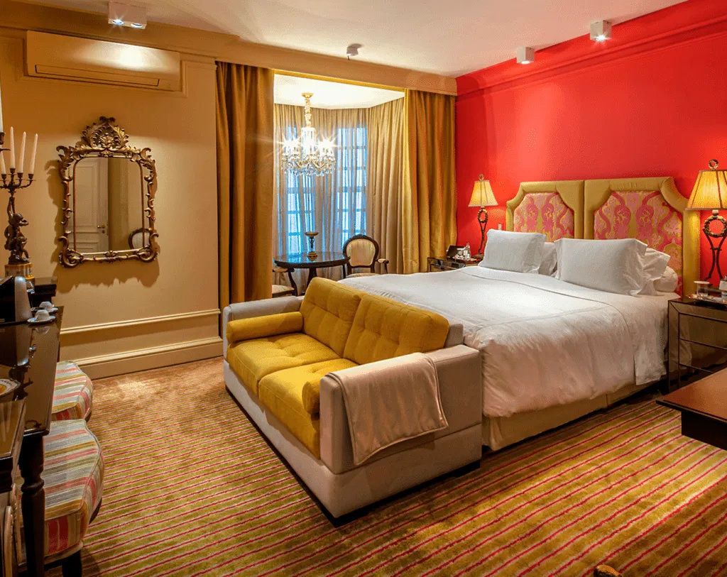- Topaz Suite - 44 sqm - This cozy suite reflects the light of the Serra Gaucha Heights, that enters through the bay window and is mirrored by the beautiful and delicate color combination of yellow gold and pink. - The bay window is an invitation to enjoying a delicious breakfast facing the wonderful view to Quilombo Valley. This makes for a beautiful way to start the day.