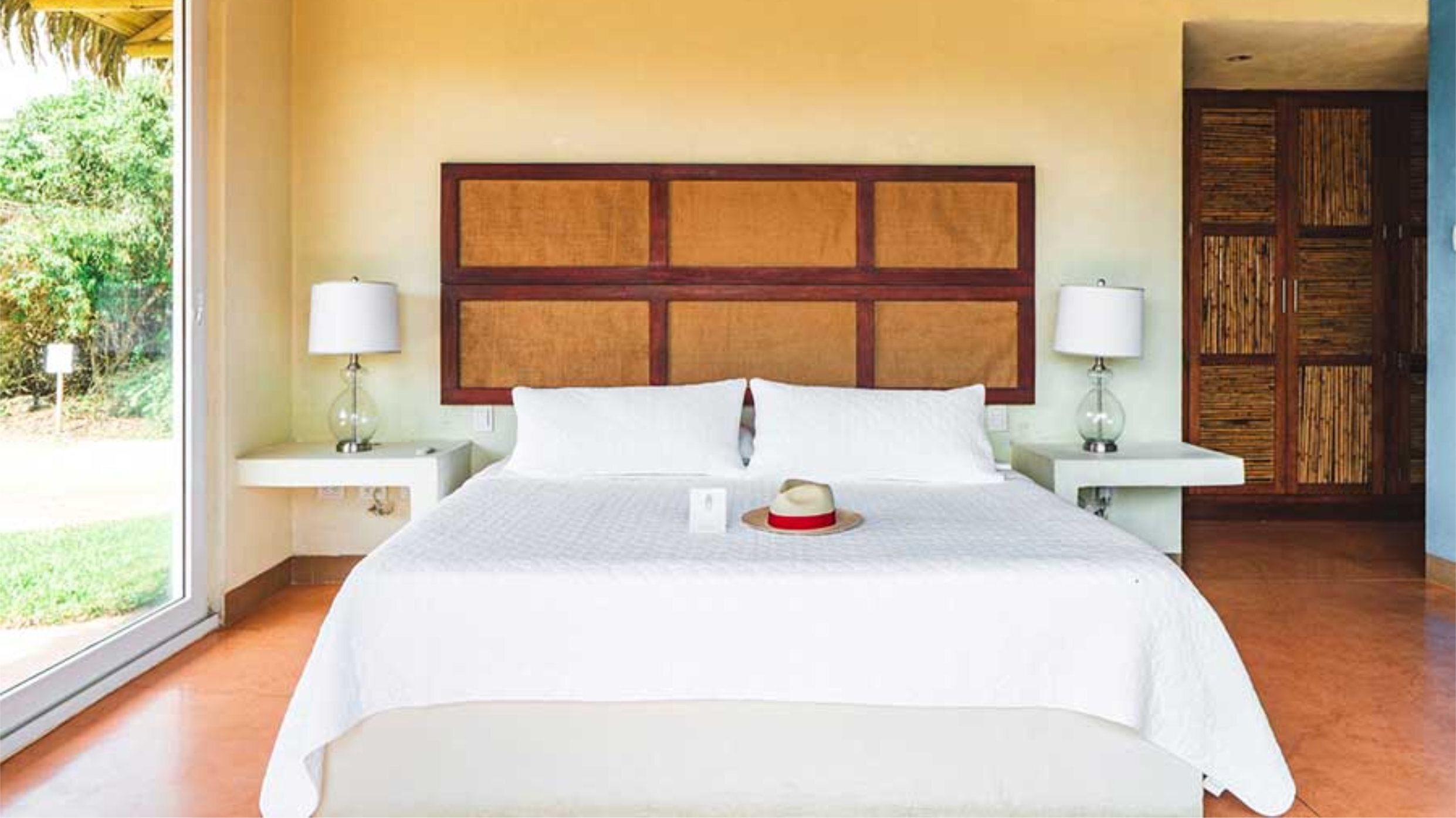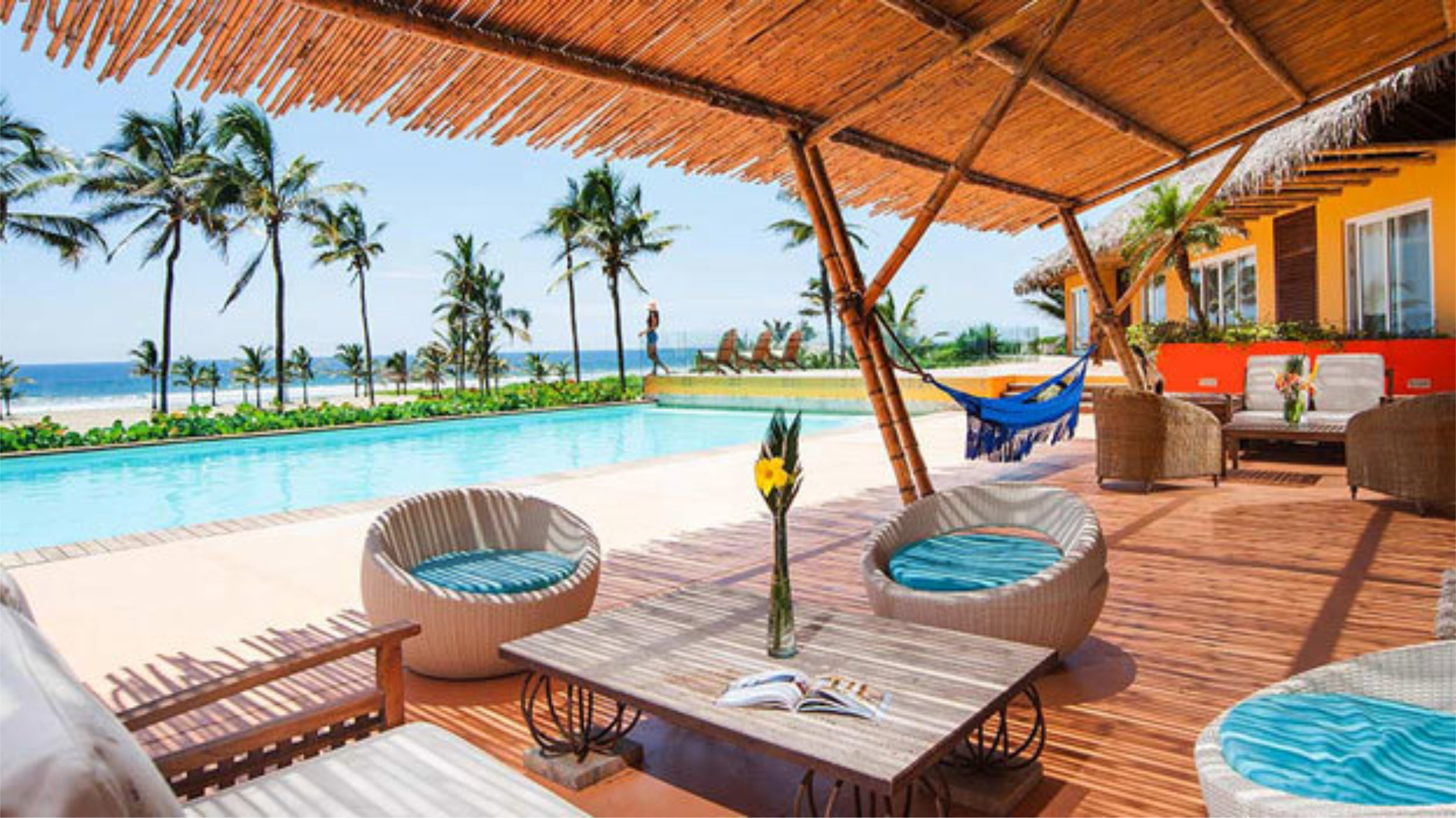 Outside the main house, near the bar, there’s an ocean-facing heated pool with a bamboo-shaded deck, a periwinkle hammock, and a sun-lounger.