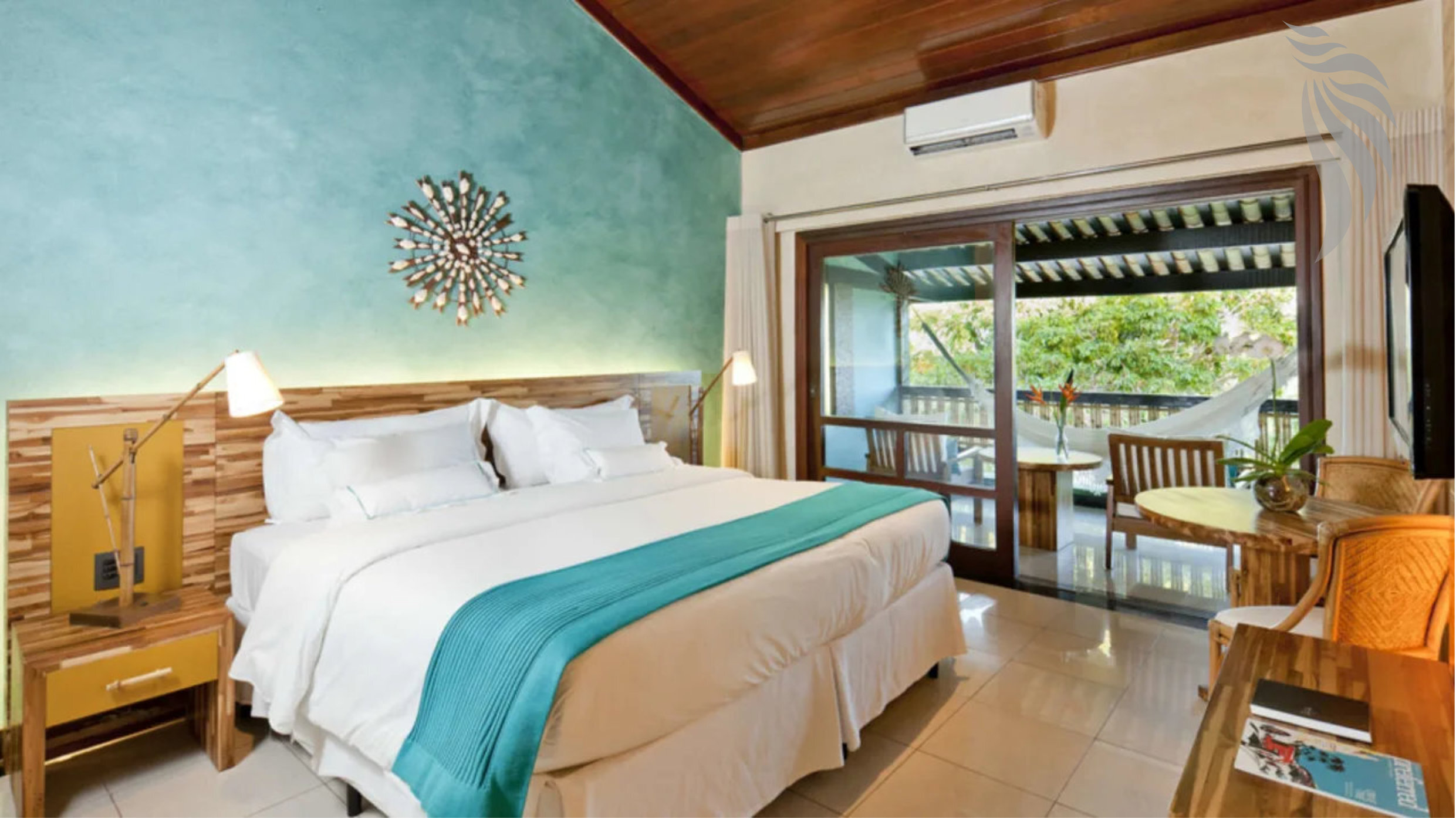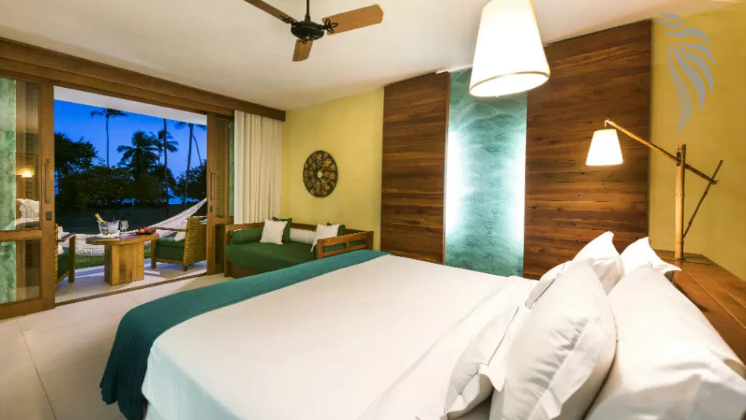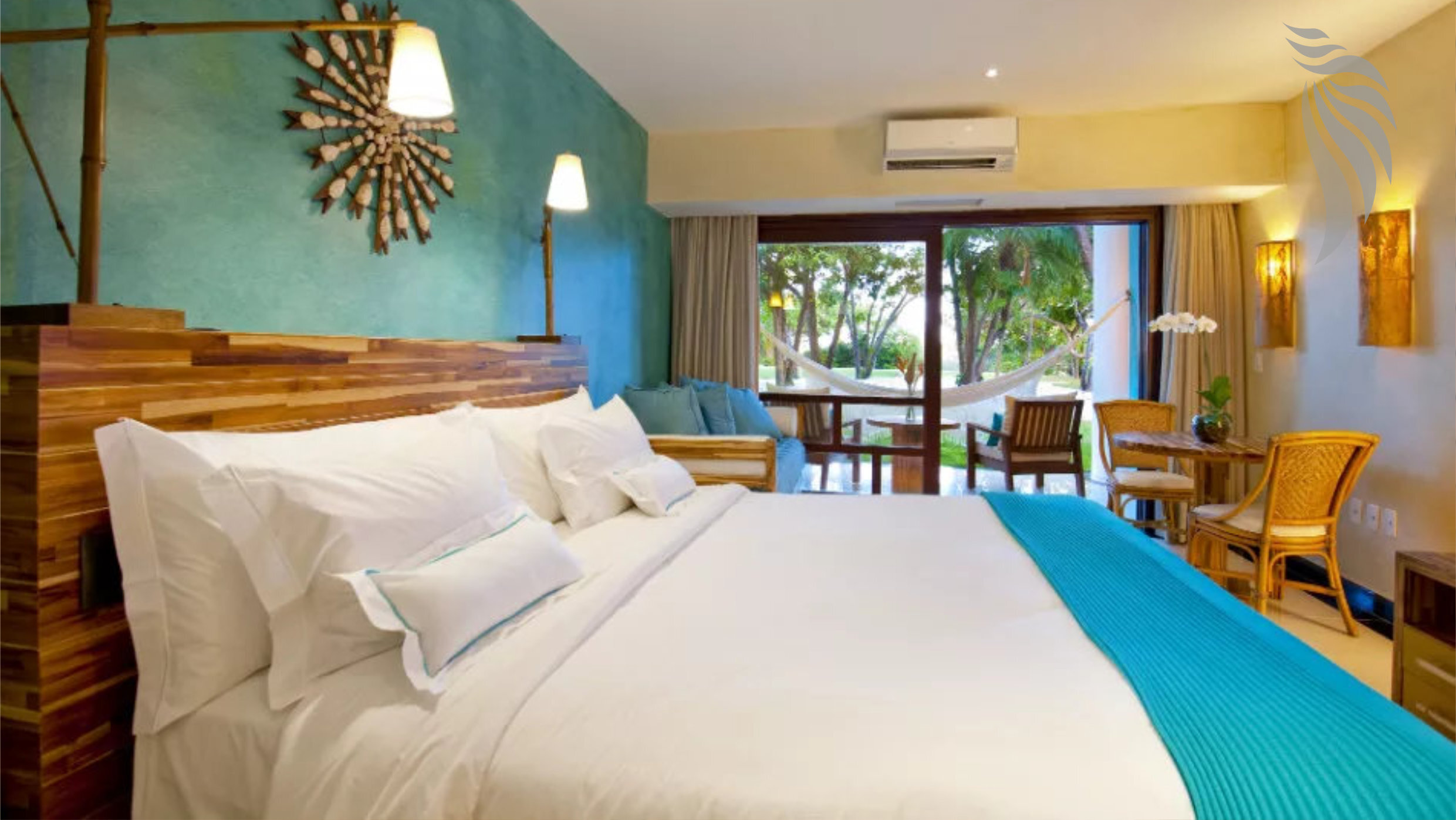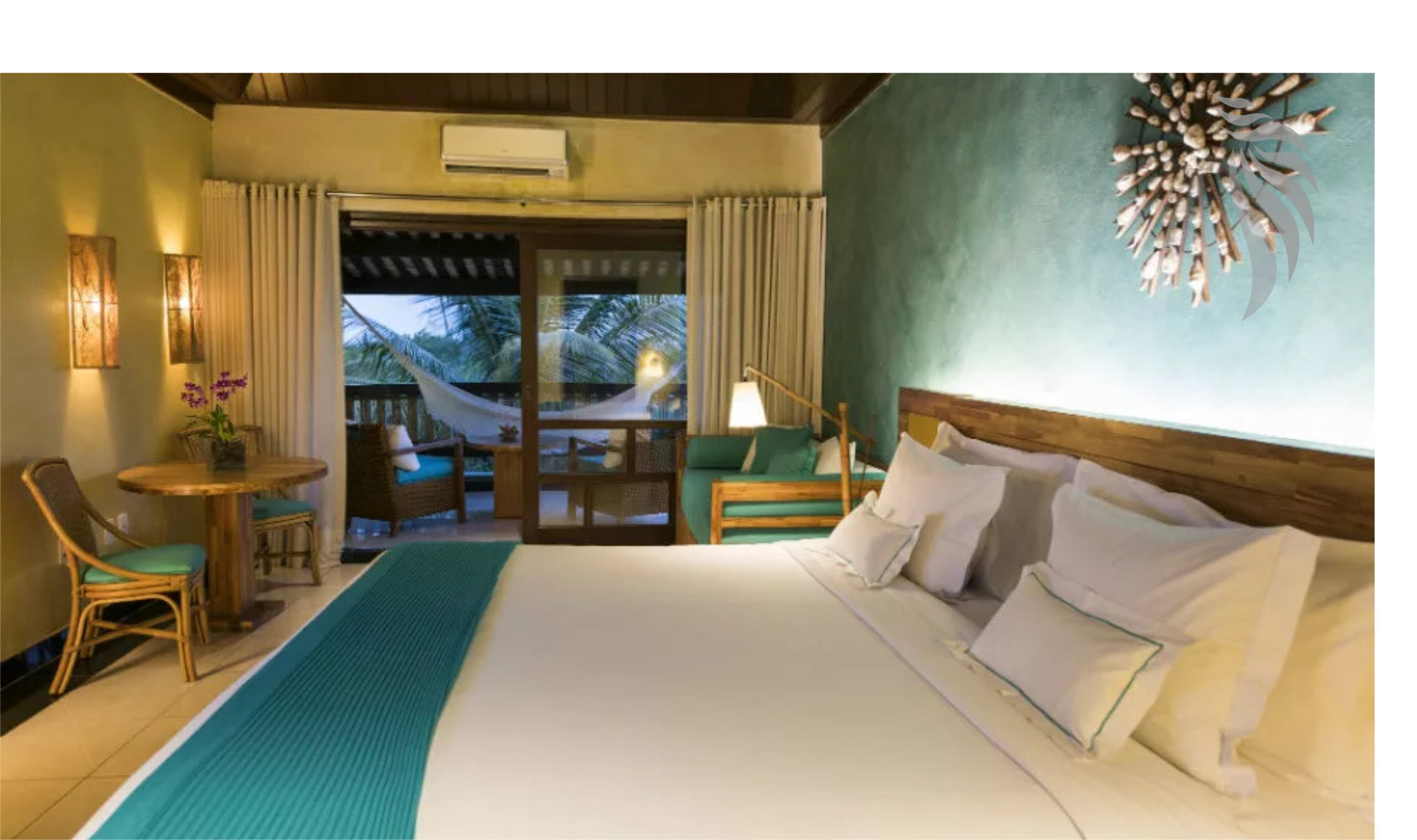 Superior Ocean category offers a spacious balcony with hammock and outdoor jacuzzi facing the sea. Located on the top floor, in a quiet place and away from the social area (wing 9), the apartment has a King Size bed, ideal for couples. In addition, the room is surrounded by a beautiful tropical garden.