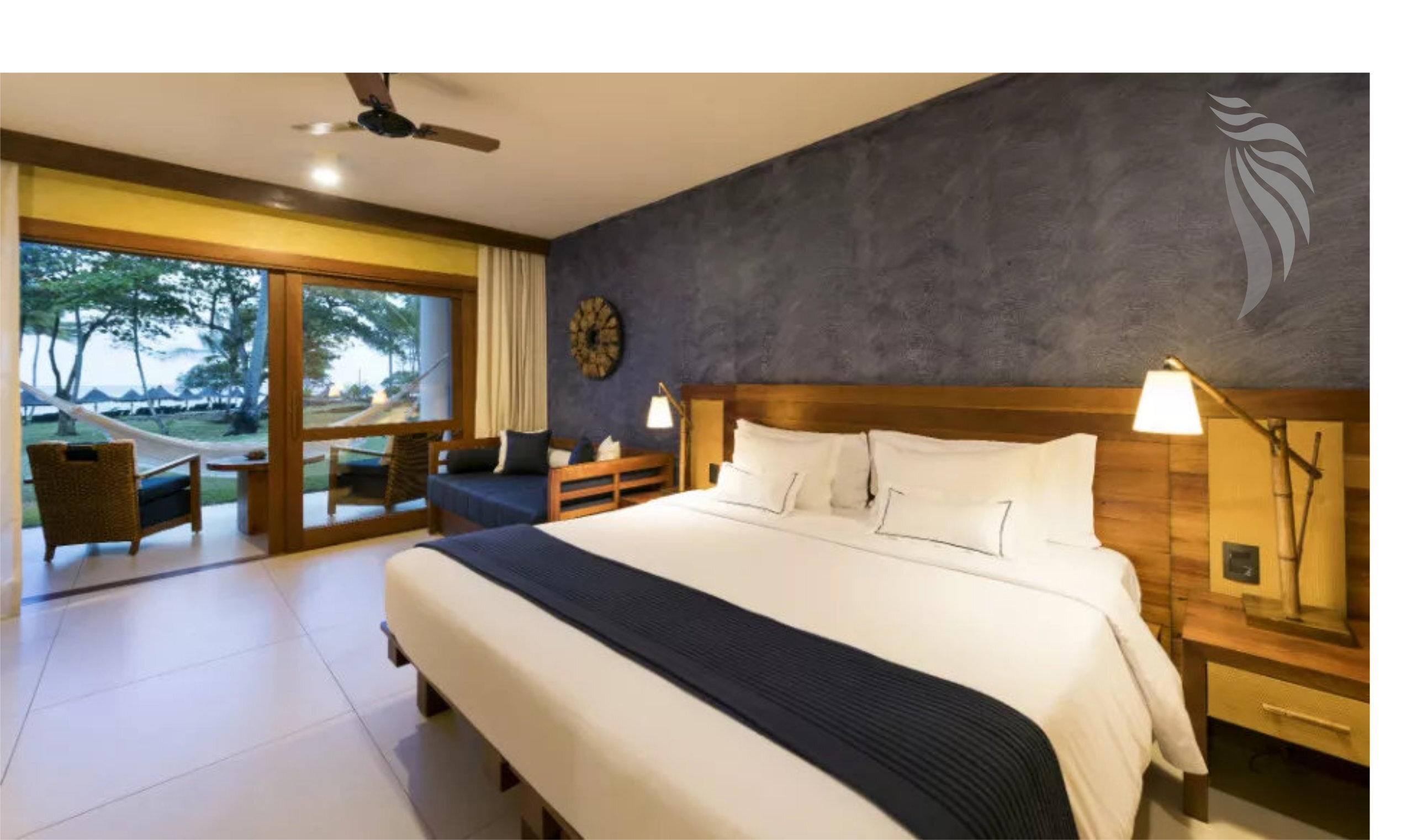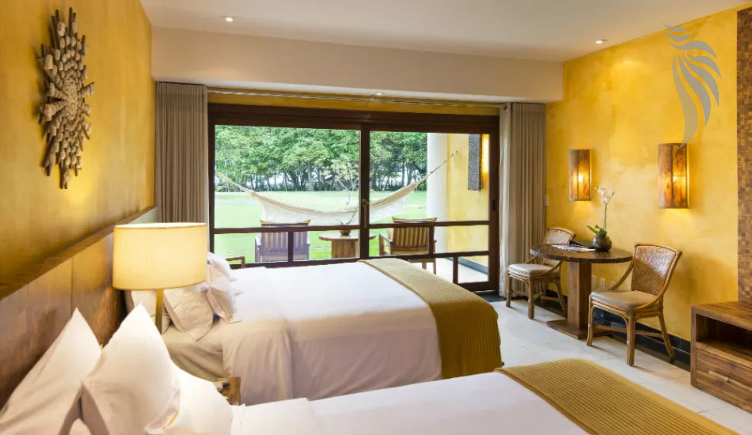 Deluxe Suite, 76m², accommodates up to two adults and two children (wings 1 to 4). Living room, bedroom with King Size bed, closet, bathroom with bathtub and double balcony with hammock. Complimentary minibar (water, soda and beer – except premium – with daily restocking), in-room breakfast until 11:30 am and access to the Spa relaxation area (+16 years old).