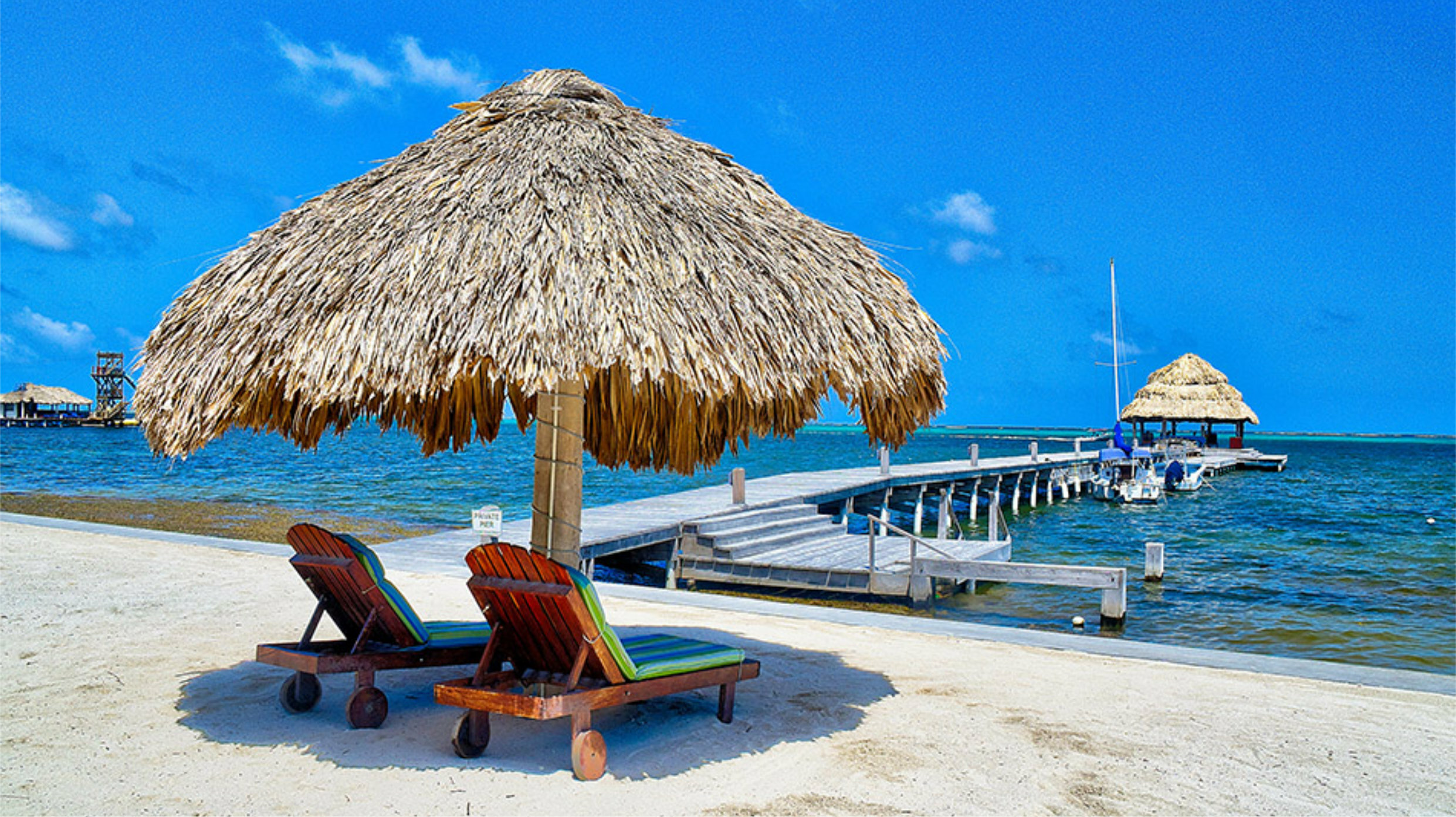 Two Bedroom Ocean Front Suite #1 and #10 is located in a dome, on the ground floor, on one level. It features panoramic windows opening onto a large private, furnished, oceanfront veranda overlooking the Caribbean Sea that surrounds Ambergris Caye, Belize and is just steps from the beach. The suite has a fully equipped kitchen, comfortable living and dining area. The master bedroom has a Queen Bed, TV and en-suite bathroom. The second bedroom has a King bed (or two twin beds) and an en-suite bathroom.