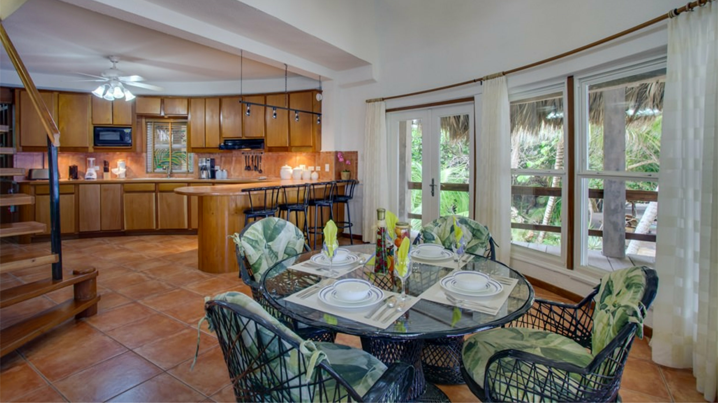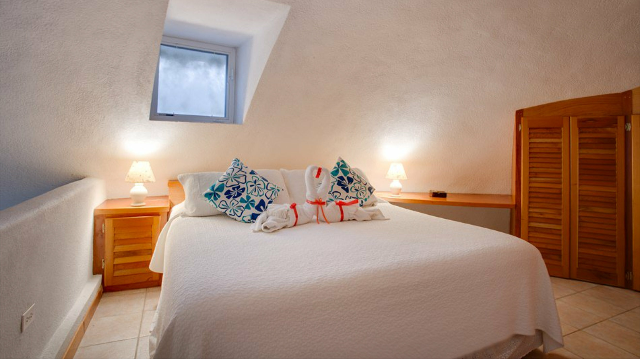 Our Loft Suites are located on the second floor on two levels. Each has a different view of the ocean, pool and/or garden. The lower level of each suite has a fully equipped kitchen, spacious living/dining area, bathroom and panoramic windows opening on to a private furnished veranda. Spiral stairs lead to an open loft with a King bed and an en-suite bathroom. Perfect for honeymooners and couples.