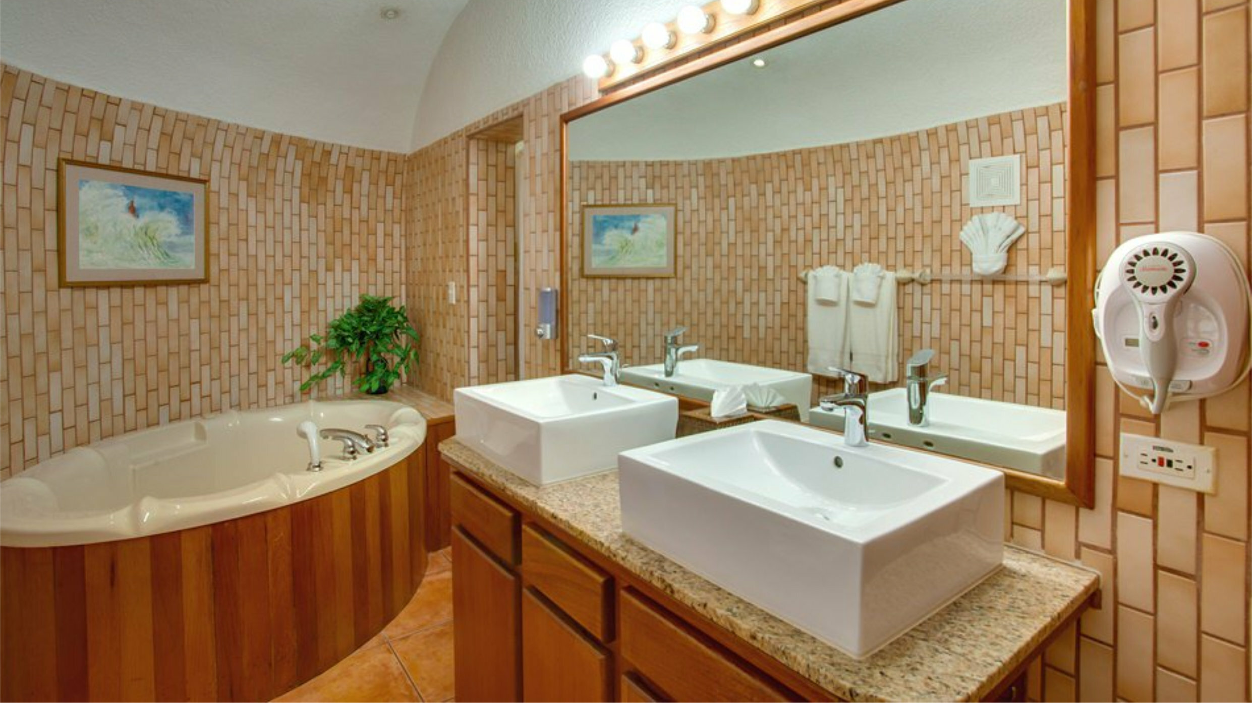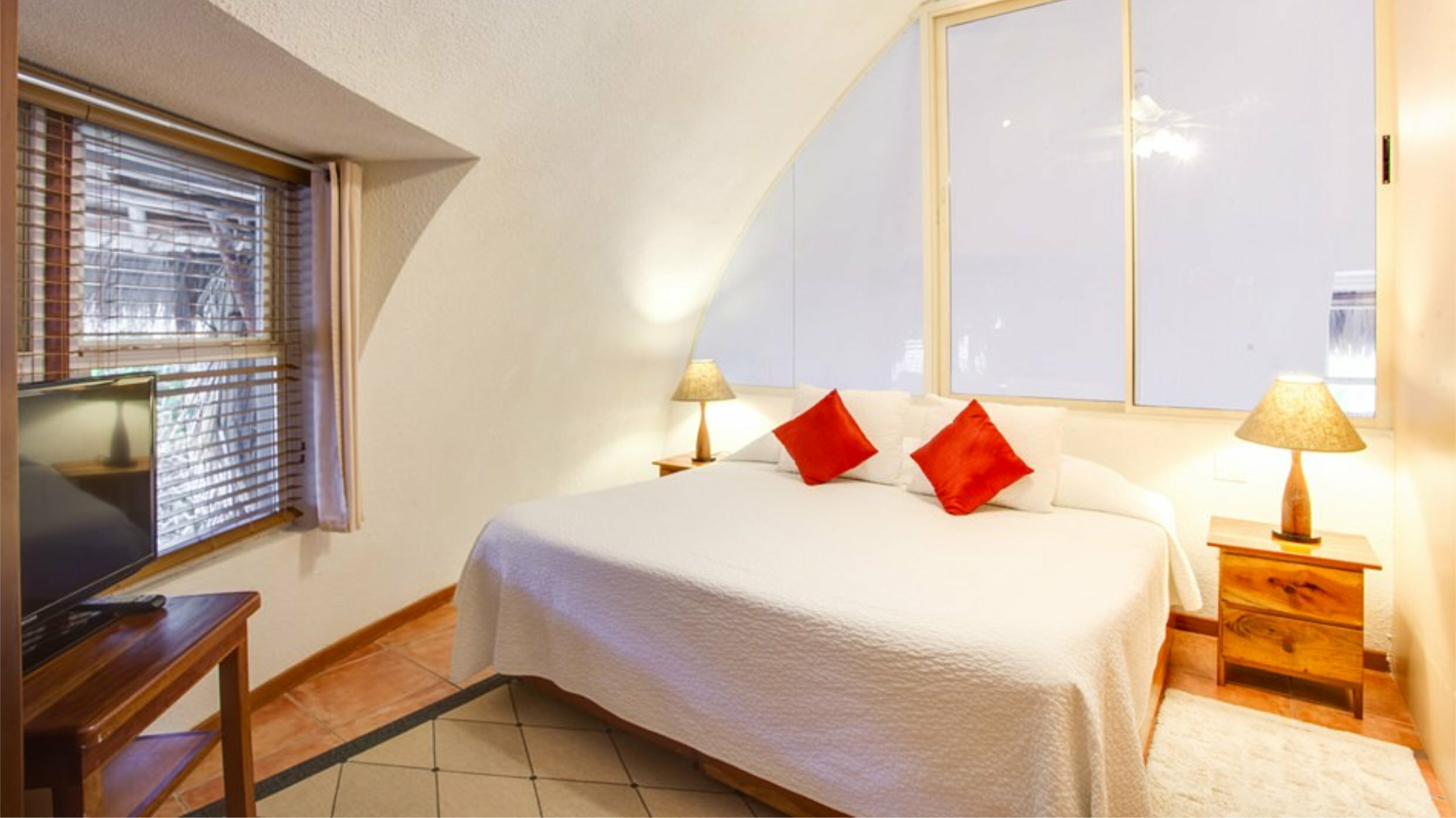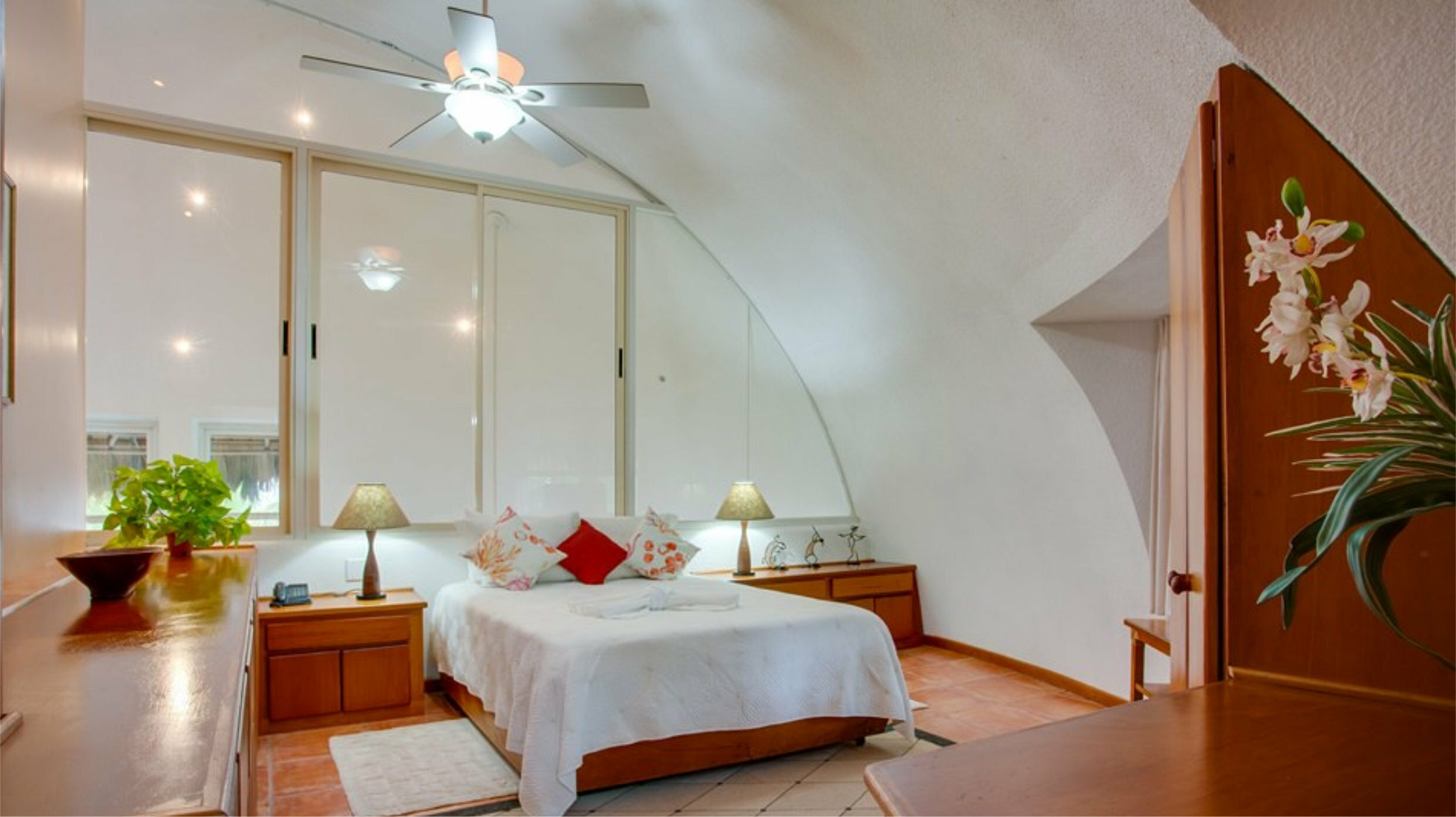 The 8 unique two bedroom suites, located throughout the resort, are available in the dome or square building, on the beach or in the gardens, on ground floor or upper levels. Each suite has a fully equipped kitchen, living and dining area, private furnished veranda, large windows with a variety of view options. Choose from a unit with one, two or three bathrooms, one or two levels, and twin, queen or king beds.