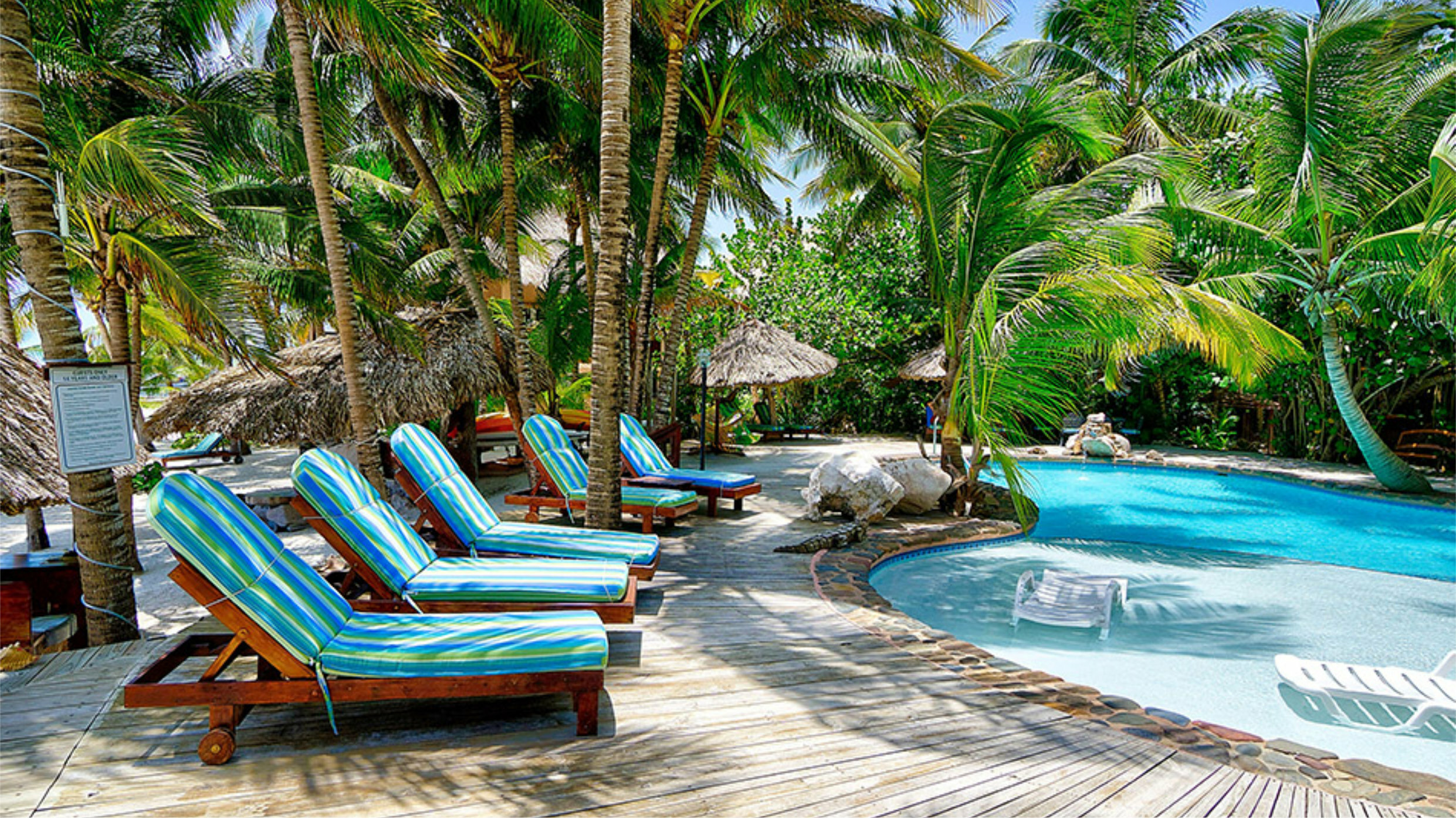Our Garden View Studio Suites are located next to each other, on the ground floor, on one level. Perfect for a couple, they are both open Studios with a Queen Bed and en-suite bathroom. There is a fully equipped kitchen, cozy living/dining area and a furnished veranda with pool and garden views and a glimpse of the Caribbean Sea that surrounds Ambergris Caye, Belize.